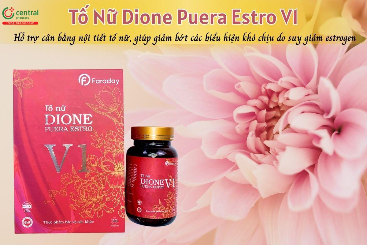 Viên uống Tố Nữ Dione Puera Estro V1 có tác dụng hỗ trợ cân bằng nội tiết tố nữ, giúp giảm bớt các biểu hiện khó chịu do suy giảm estrogen như bốc hỏa, khô và sạm da, da nhăn nheo hay lão hóa sớm.