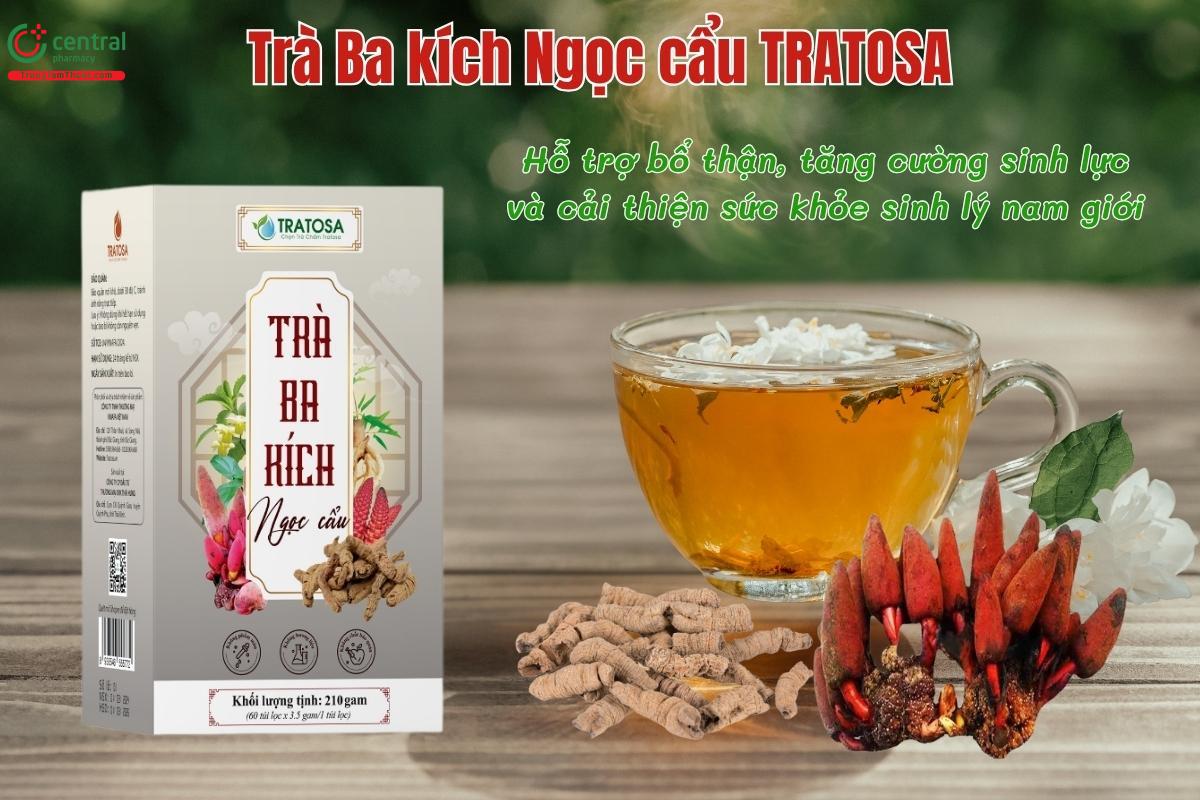 Trà Ba kích Ngọc Cẩu TRATOSA là sự kết hợp các thảo dược thiên nhiên như ba kích, nấm ngọc cẩu, Nhục Thung Dung, Đinh Lăng, Dâm Dương Hoắc và cỏ ngọt, được biết đến với tác dụng bồi bổ thận, tráng dương và nâng cao sinh lực nam giới. Vị ngọt của trà đến từ cỏ ngọt, mang vị ngọt tự nhiên nhưng không sinh năng lượng, phù hợp cho người tiểu đường và người cao huyết áp.
