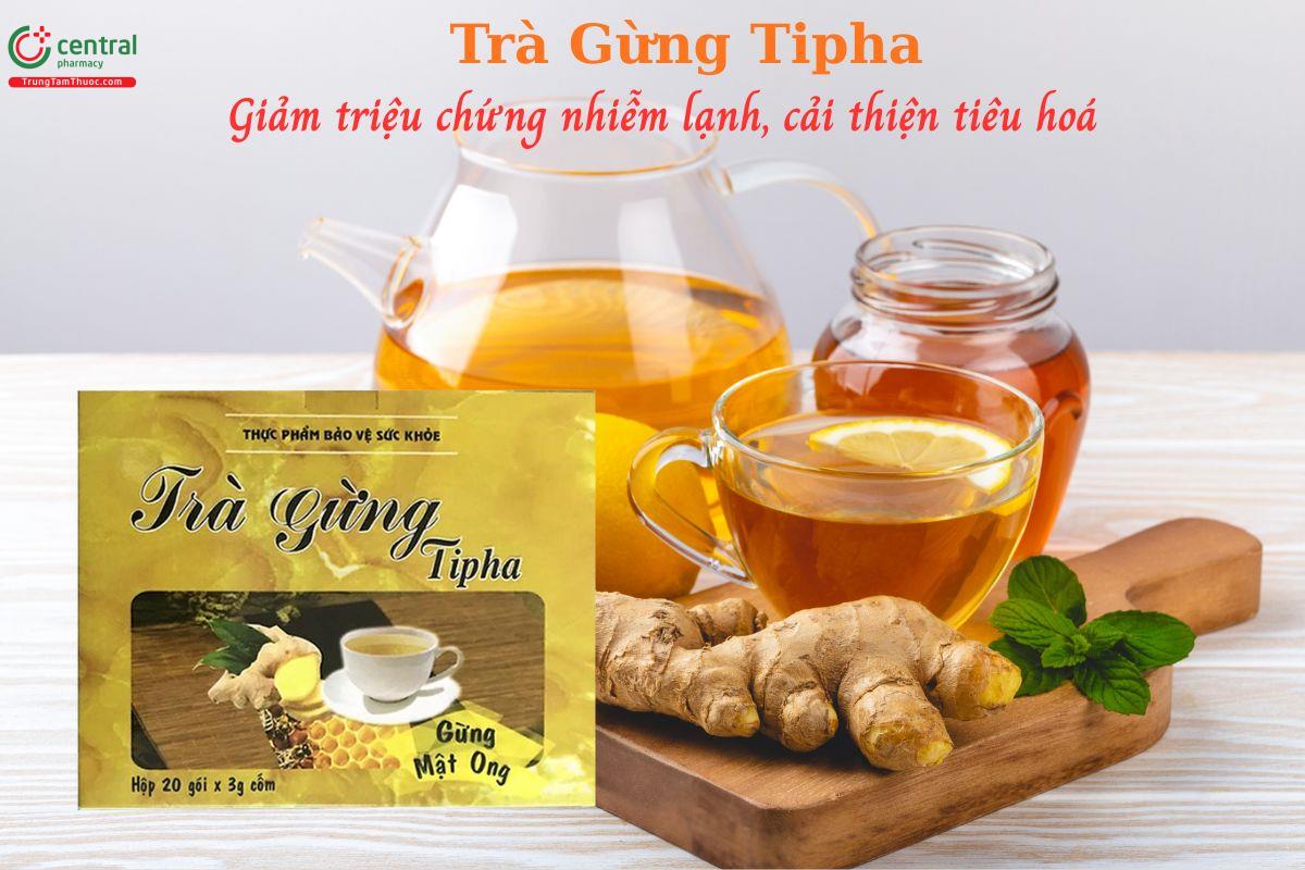- Trà Gừng Tipha với sự kết hợp của gừng và mật ọng mang lại hiệu quả giúp làm ấm cơ thể, giảm các triệu chứng khi bị nhiễm lạnh, đồng thời cải thiện tiêu hoá, giảm đầy hơi, trướng bụng.