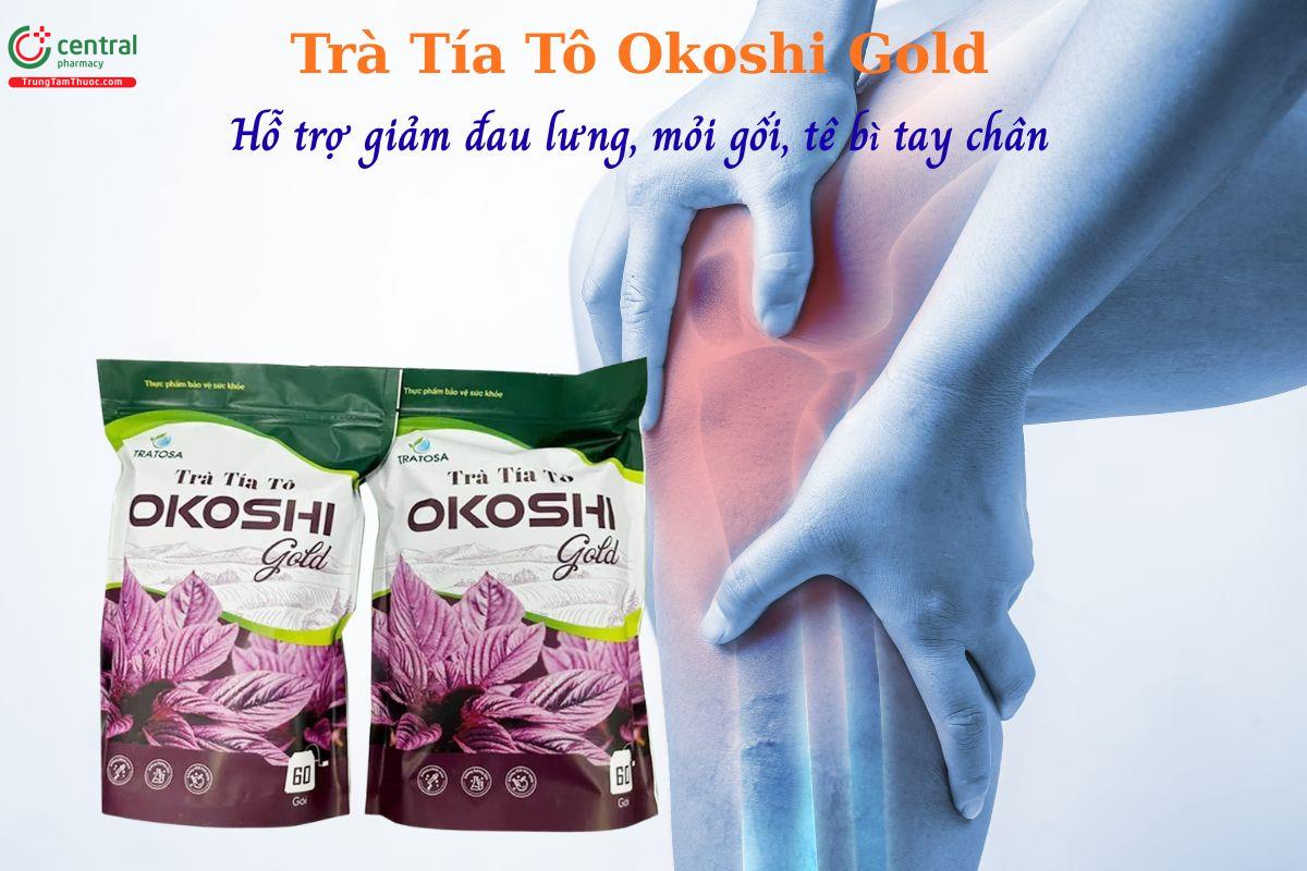- Trà Tía Tô Okoshi Gold mang lại hiệu quả trong việc nâng cao sức khỏe xương khớp, hỗ trợ cải thiện tình trạng đau lưng, mỏi gối, tê bì tay chân.