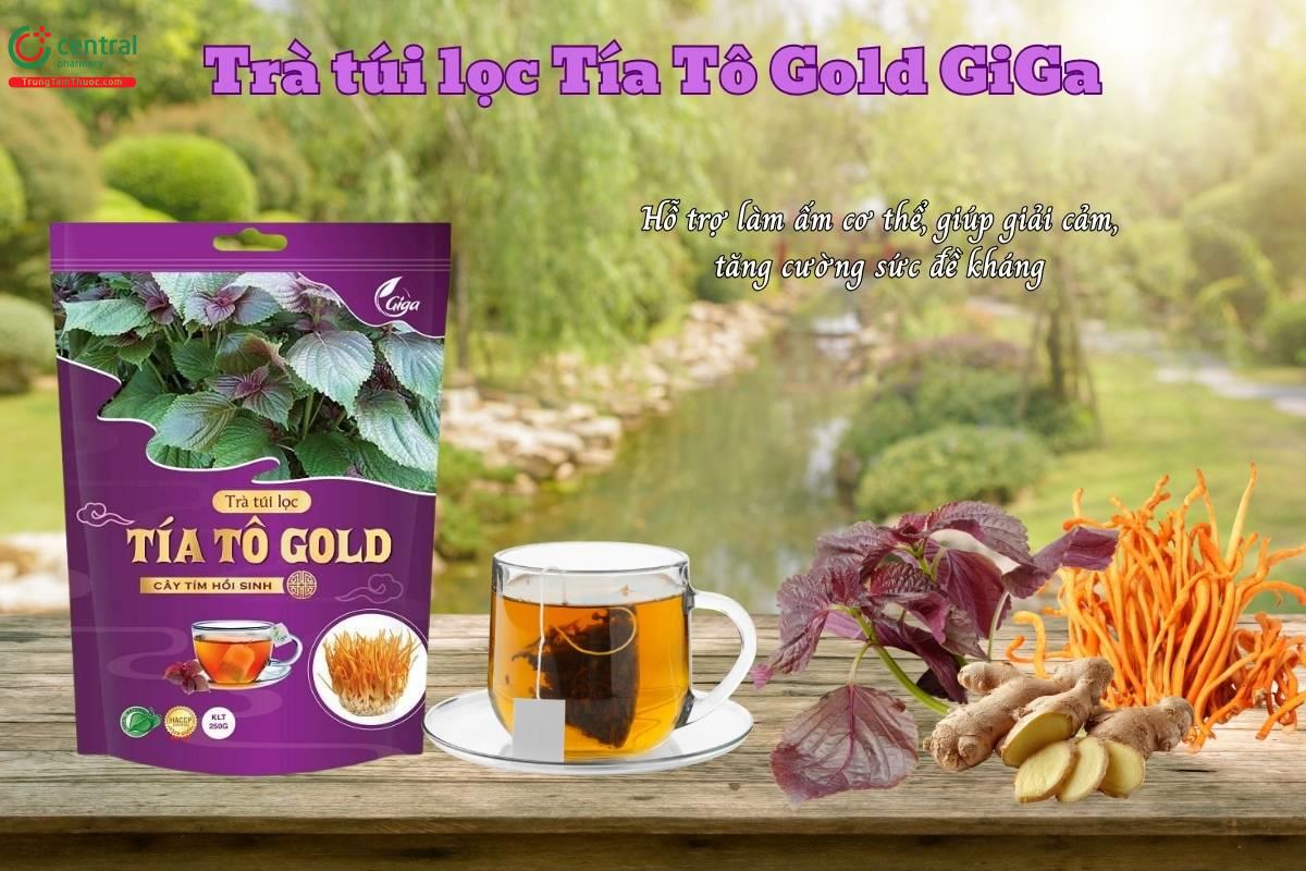 - Trà túi lọc Tía Tô Gold GiGa kết hợp các thảo dược thiên nhiên như tía tô, đông trùng hạ thảo và gừng mang đến hương vị dễ chịu và thanh mát.
