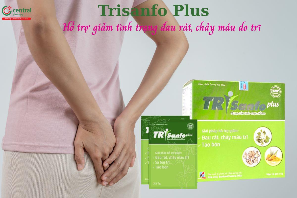 - Trisanfo Plus mang lại hiệu quả cao trong việc giảm các triệu chứng của bệnh trĩ, đồng thời hỗ trợ nhuận tràng, giảm táo bón.