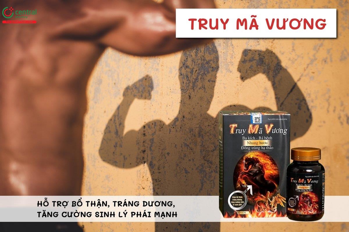 Truy Mã Vương hỗ trợ bổ thận, tráng dương và tăng cường sinh lý nam giới nhờ sự kết hợp của các thảo dược quý như Nhục thung dung, Ba kích, Thục địa, Đương quy và Nhung hươu…