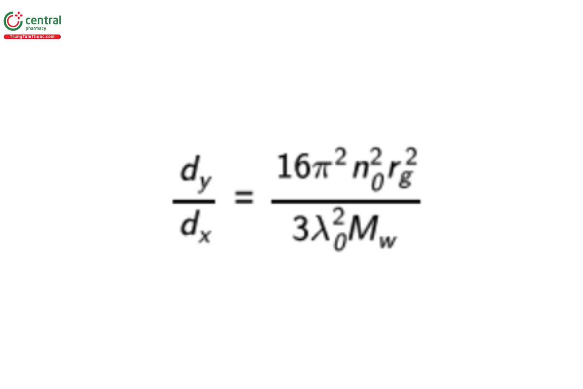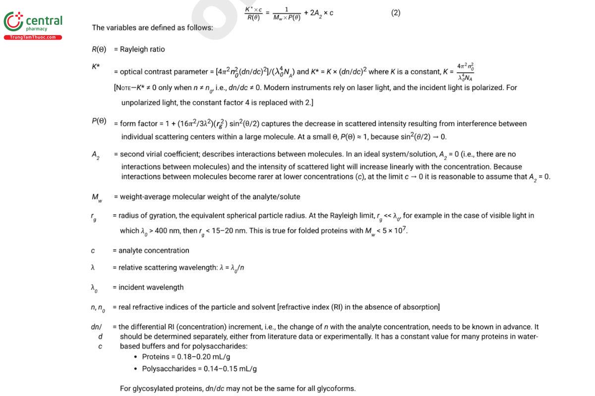 where n0 is the RI of the solvent, rg is the root mean square radius (radius of gyration, molecular size), λ0 is the vacuum wavelength of the laser, and Mw is the molecular weight.