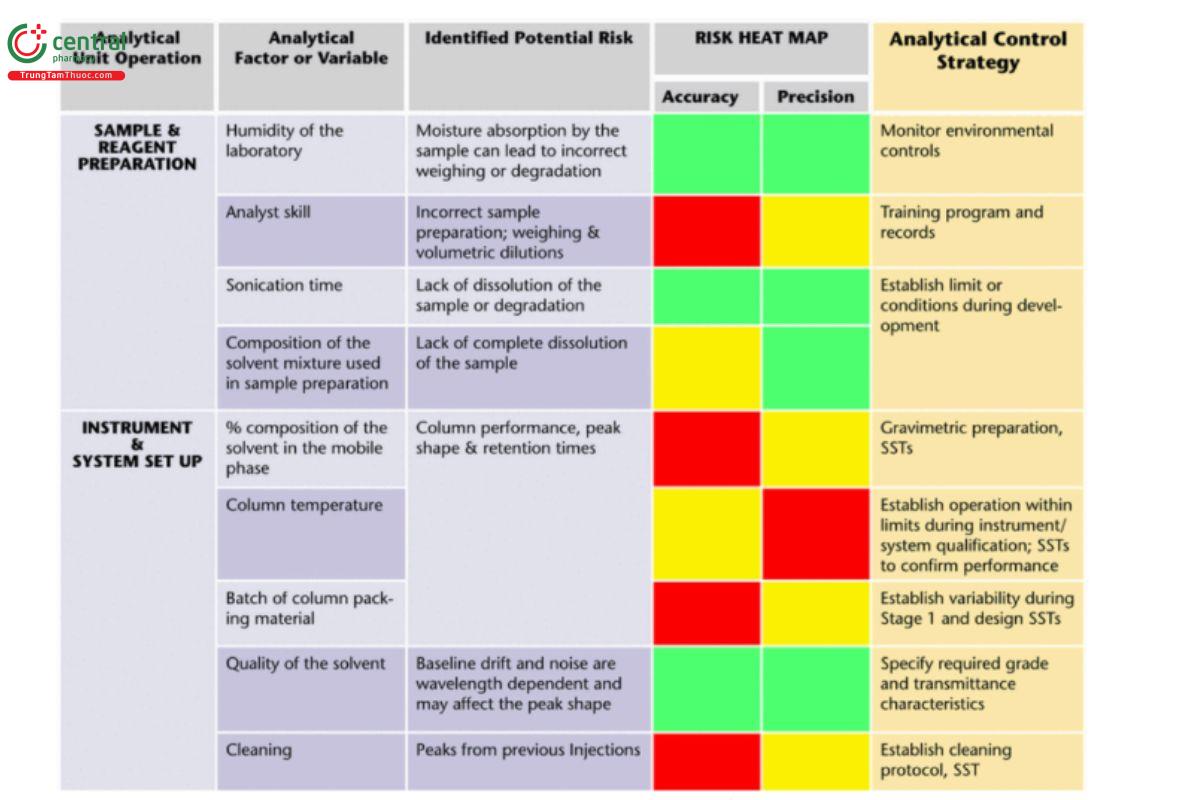 Table 1. Example of heat map capturing a qualitative risk assessment related to sample preparation and HPLC setup steps from an analytical procedure. Impact levels are strong (red), medium (amber), and minor (green).
