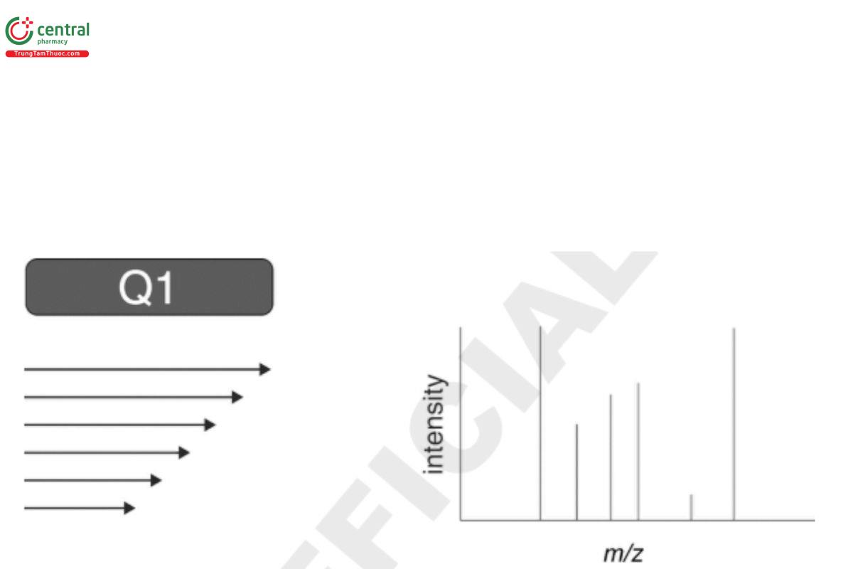 Precursor ion: The precursor ion scan mode is illustrated in Figure 4C. Application of the precursor ion scan mode is performed when the first mass analyzer (Q1) is scanned and allows all ions created in the ion source to pass into the collision cell (Q2). The second mass analyzer (Q3) is held at a specific m/z ratio that corresponds to a diagnostic or unique fragment ion of the molecule or class of molecules. The resulting precursor ion MS–MS spectrum contains all molecular ions that contain a diagnostic fragment ion. The precursor ion scan mode requires that the product ion experiment be performed to confirm the diagnostic fragment ion(s). This scan mode can be used to screen for molecules that contain a specific substructural feature such as a peptide residue. The precursor ion scan mode is available on triple-quadrupole, magnetic sector, and some hybrid instrumentation.