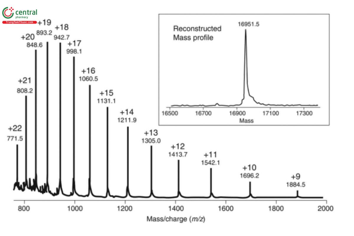 ESI often is referred to as a soft-ionization procedure because typically it does not result in fragmentation of the analyte during the ionization process. The development of this ionization technology was crucial for the analysis of large biopolymers (e.g., proteins) because it allows the addition of multiple charges to a single molecule, thus bringing the m/z of the analyte into a suitable m/z range for many types of mass analyzers. For example, Figure 3 shows the ESI charge state distribution for equine heart apomyoglobin as analyzed on a simple single quadrupole instrument with an upper scan limit of m/z 2000. The series of multiply charged ions allows the spectrum to be collected within the instrument's working m/z range. The ability to calculate the intact mass of the protein from a combination of all the charge states allows a more accurate average mass (see inset in Figure 3) to be determined (within 0.1% on a simple quadrupole instrument). Thus ESI methods are critically important for the analysis of large biomolecules.