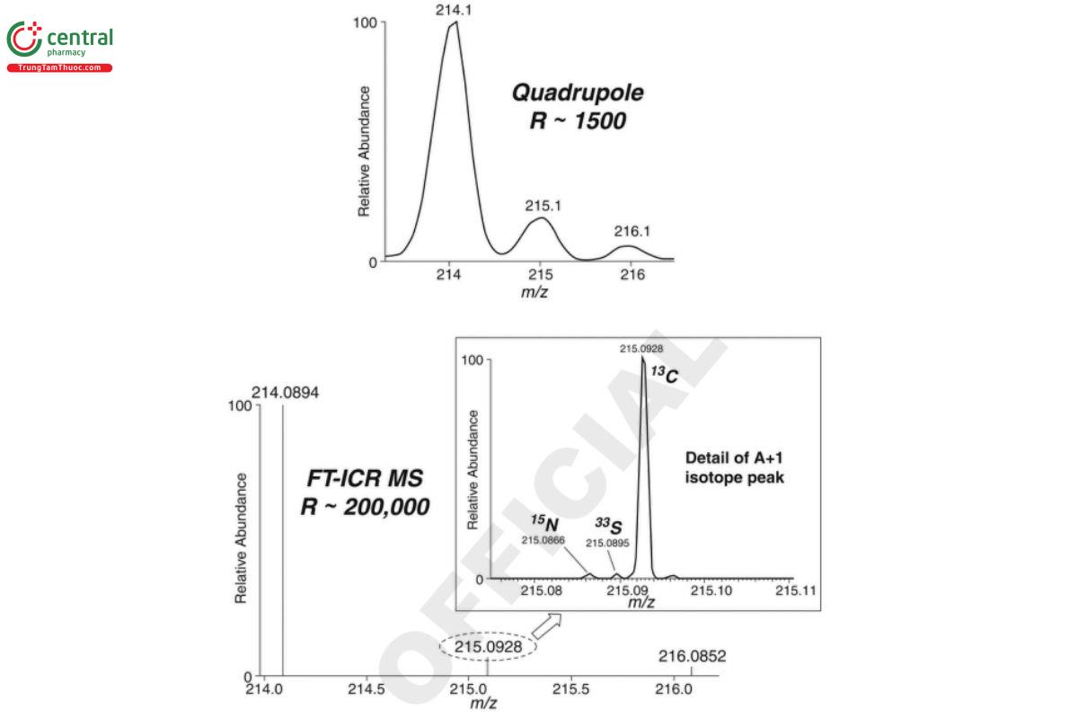 Figure 5 presents the isotopic pattern in the molecular ion region for n-butyl benzenesulfonamide collected using ESI with different mass spectrometers, each having different mass resolution. With nominal mass (i.e., quadrupole mass spectrometer) resolution, one can clearly see the A + 1 (m/z 215) and A + 2 (m/z 216) peaks of the [M + H]+ ion at m/z 214. The major contributor to the A + 1 peak results from the occurrence of versions of the molecule containing 13C, and the major contributor to the A + 2 peak, is naturally occurring 34S. With a higher resolution mass spectrum, the more accurately calculated relative abundances of the A + 1 and A + 2 peaks could be used to estimate the number of carbon and sulfur atoms in the molecule, respectively. An examination of the FT–ICR mass spectrum illustrates the additional isotopic information that can be obtained under even higher-resolution conditions. This spectrum clearly shows that the A + 1 peak, seen as one peak with the other two mass spectrometers, also has contributions from other isotopes. At resolutions afforded by ICR or orbital trapping mass spectrometers, the various contributors to the A + 1 peak can be observed, and one would get a more accurate estimate of the atoms present.