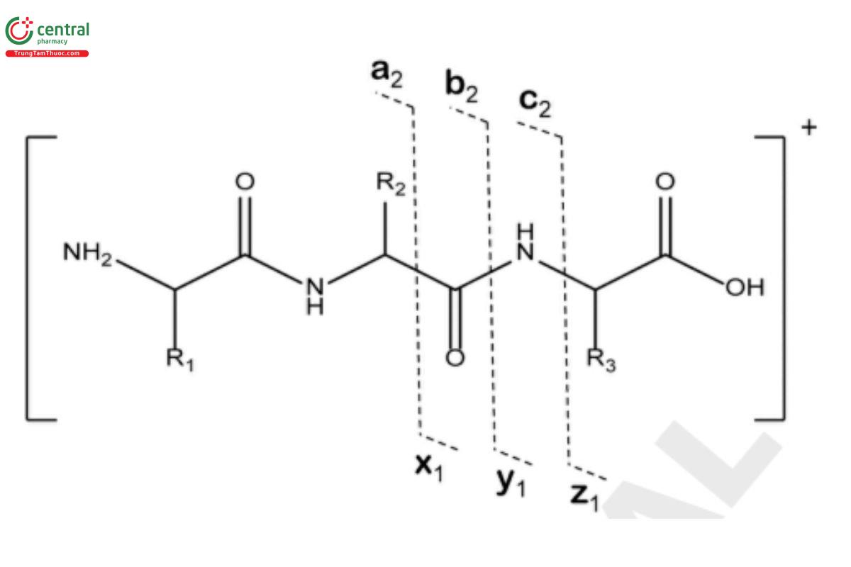 Database searching: Because of progress in whole-genome sequencing and the computing power of predictive algorithms for the annotation of all possible genes, mRNAs, and proteins from genomic information, the characterization of unknown protein and peptide therapeutics rarely requires complete de novo sequence evaluation. Instead, the compound can be initially identified by digestion and sequencing by peptide fragmentation. This is possible because various fragmentation strategies (e.g., CID and ETD as described previously) produce gas-phase fragment ions from protonated peptides that represent consistent cleavage positions along the peptide backbone. The Roepstorff nomenclature for general peptide fragmentation along the peptide backbone is shown in Figure 6A. Peptide fragments that maintain a charge on the C-terminus are the x, y, or z ions, and those that maintain a charge on the N-terminus are known as a, b, or c ions. By optimizing the fragmentation energies and the collision gas to target only a single fragmentation event per protonated peptide molecule, analysts can use the collective fragmentation spectra from a given peptide to produce a set of fragment ions from the same series (i.e., b ions or y ions) that vary by the residue mass of each amino acid. In this manner they can derive the sequence. A schematic of a peptide fragmentation prole with a complete set of y ions is shown in Figure 6B. The complete set of y ions allows the sequence to be determined from the mass difference between the ions that correspond to residue masses for each amino acid. With the development of complete databases of many genes, transcripts, and proteins, a variety of commercially available computer algorithms have been developed to match the fragmentation masses with protein sequences in databases, along with false discovery rates and confidence probabilities. As a result, confirmation of protein sequences for known proteins can be fully automated for data collection and evaluation.
