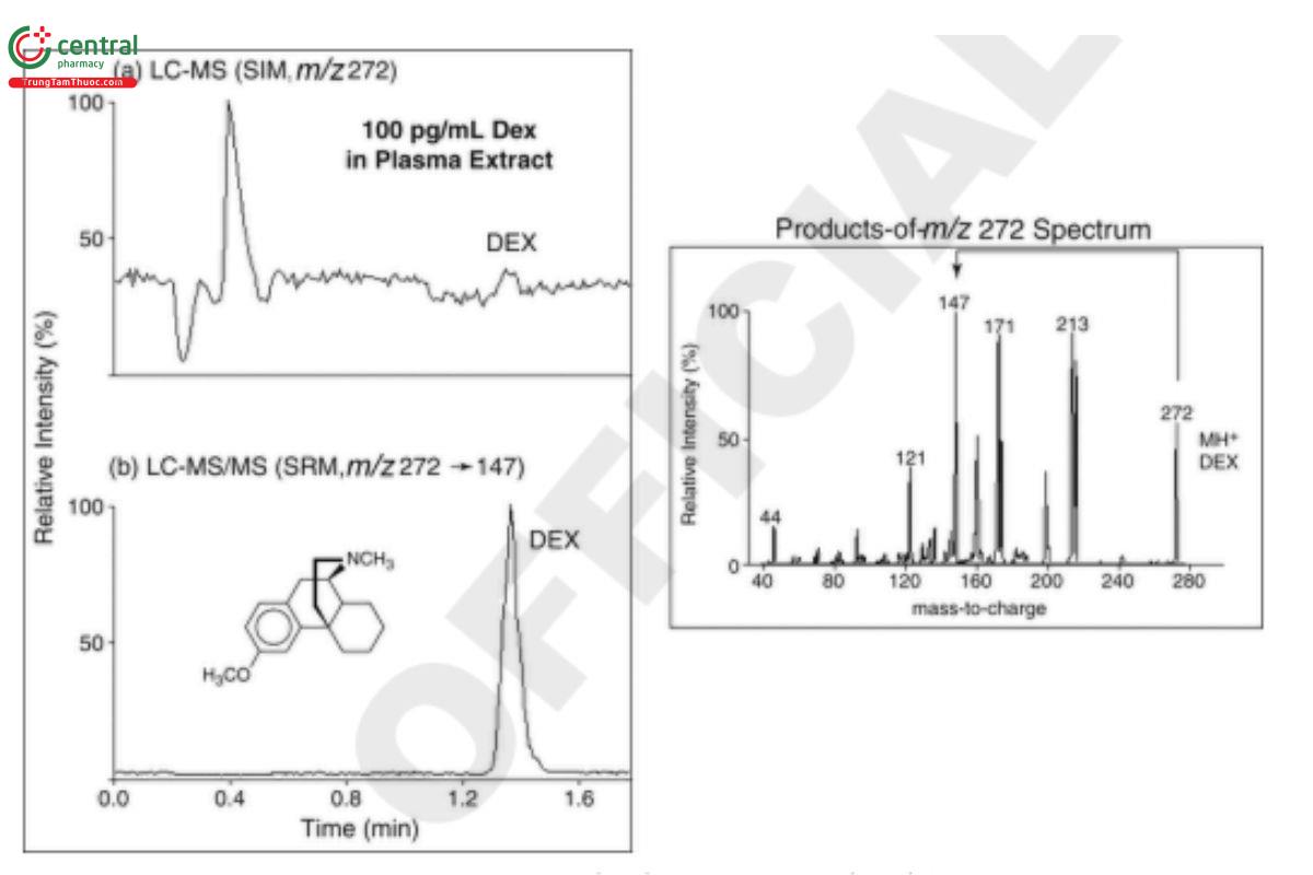 The relative benet of MS/MS detection is illustrated in the extreme example presented in Figure 8. The antitussive Dextromethorphan (Dex) is present in a plasma extract at 100 pg/mL. This extract is first analyzed by LC–MS using ESI–SIM at m/z 272 (protonated molecule). In this experiment the SIM chromatographic peak corresponding to Dex is barely discernible above the relatively high background noise. Alternatively, a triple quadrupole can be employed to set up a selected reaction monitoring (SRM) detection scheme for added selectivity. SRM is a special case of product ion MS–MS in which the second mass analyzer is tuned to pass only a selected fragment ion corresponding to Dex (m/z 147 in this example). A marked enhancement in selectivity, and therefore signal-to-noise ratio, is evident and typically leads to improved performance for quantitative analytical methods.