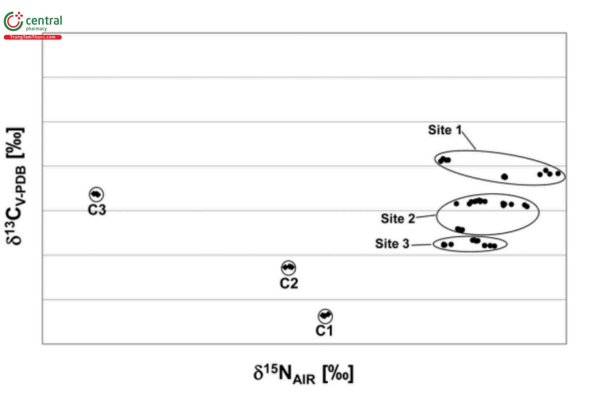 Figure 9. Bivariate plot of stable isotopic composition (δ13C versus δ15N) of authentic drug product from three global manufacturing sites (Sites 1–3) and three counterfeit drug products (C1–C3).