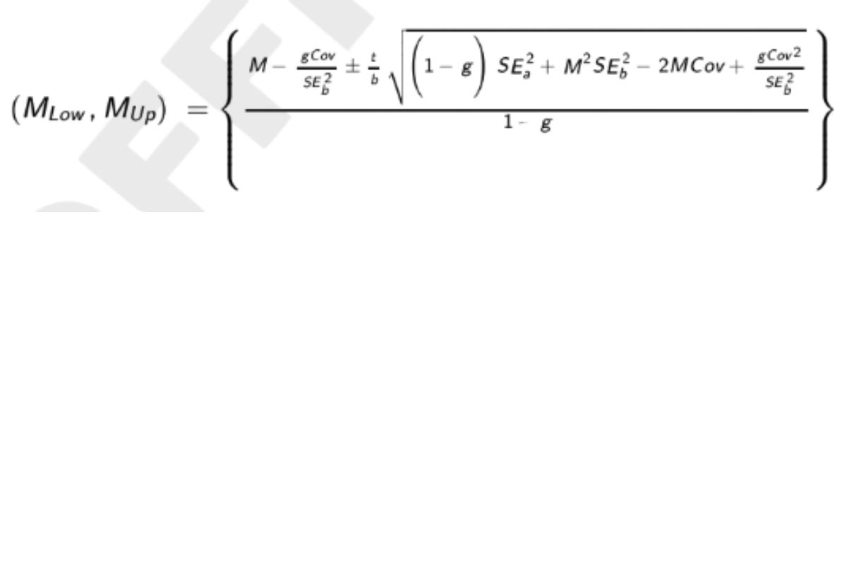and t = tdf,α/2 b is the upper a/2 percentage point (or the two-sided a percentage point) with the residual degrees of freedom, df, from the statistical analysis and chosen confidence level, 100*(1−α), (usually 95%). If g ≥ 1, it means that the denominator, b, is not statistically significantly different from 0 and the use of the ratio is not sensible for those data. The length, L, of this confidence interval is Mup - M Lovi For those cases in which the estimates of a and b are statistically uncorrelated (Cov = 0), the confidence interval formula simplifies to the following: