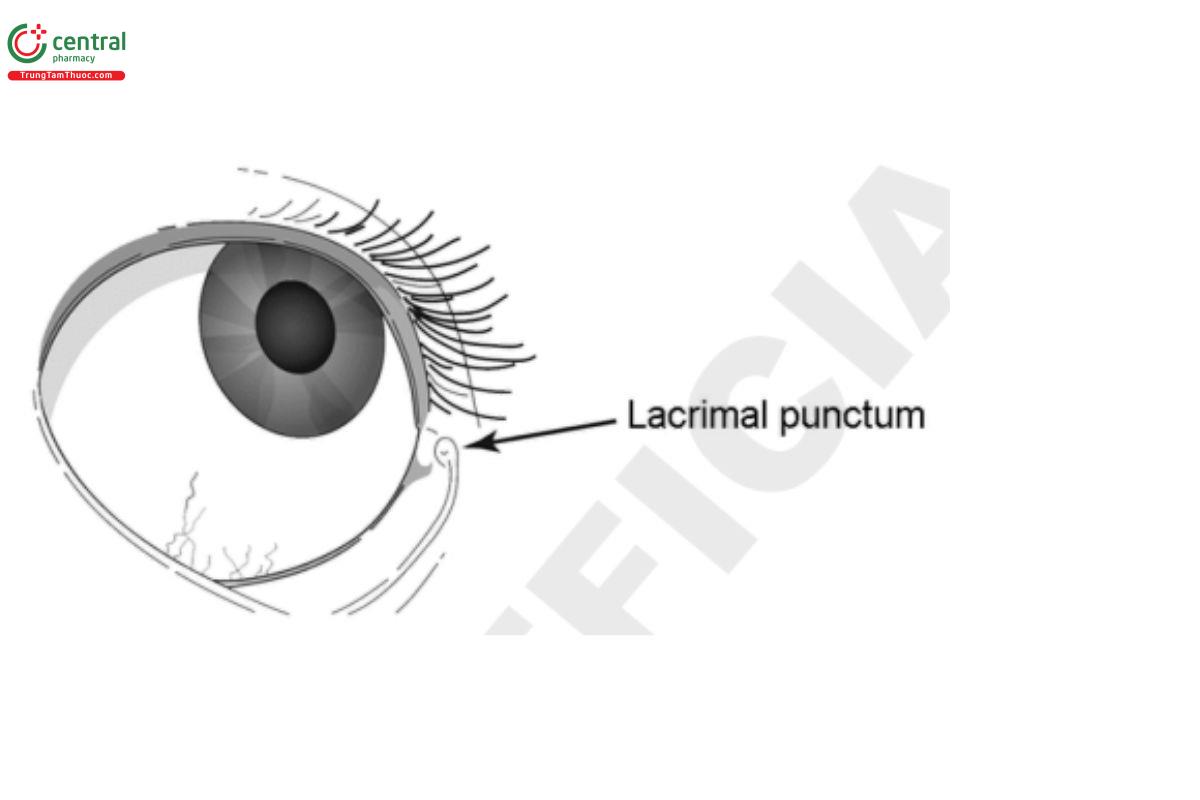 Ophthalmic inserts and ocular systems are solid dosage forms of appropriate size and shape that are placed in the conjunctival fornix, in the lacrimal punctum (Figure 2), or on the cornea. Inserts can usually be removed, if adverse effects develop, and can provide extended release of the drug over a certain period of time. Inserts can be classified as bioabsorbable (soluble) or non-bioabsorbable (insoluble). Drug release from soluble inserts involves two steps: 1) fast release of a portion of the drug as the tear fluid penetrates into the system and 2) slow release as a gel layer is formed on the surface of the insert. Collagen shields made from porcine sclera collagen or bovine corium tissue-and devices obtained by molding, extrusion, or compression (minitablets) of gelling polymers-belong to this category of soluble inserts. Bioabsorbable polymers (e.g., cross-linked gelatin derivatives and polyesters) can be used to prepare bioabsorbable inserts; these matrices act as reservoirs or interact with the drug molecules through labile bonds.