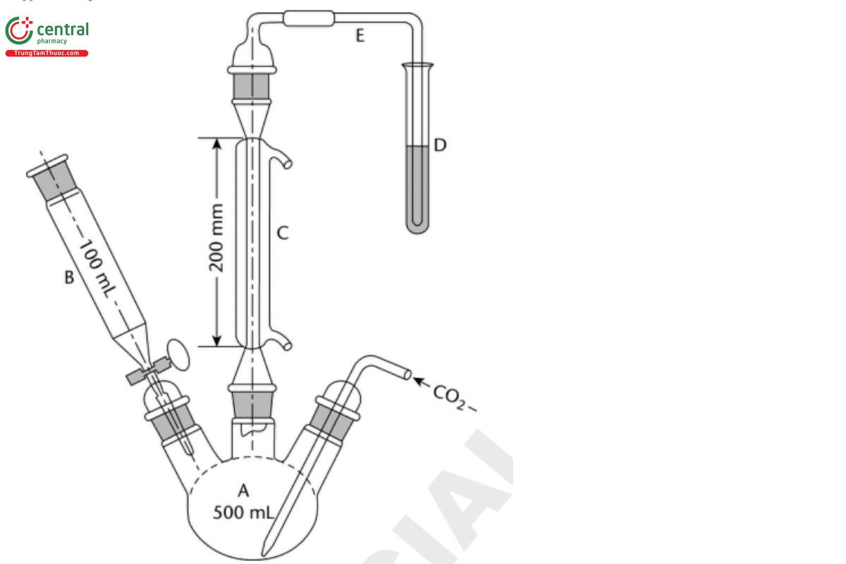 In this test, the sulfur dioxide is released from the sample in a boiling acid medium and is removed by a stream of carbon dioxide. The separated gas is collected in a dilute hydrogen peroxide solution where the sulfur dioxide is oxidized to sulfuric acid and titrated with standard alkali. The apparatus consists essentially of a 500-mL three-neck, round-bottom boiling flask, A; a separatory funnel, B, having a capacity of 100 mL or greater; a gas inlet tube of sufficient length to permit introduction of the carbon dioxide within 2.5 cm of the bottom of the boiling flask; a reflux condenser, C, having a jacket length of 200 mm; and a delivery tube, E, connecting the upper end of the reflux condenser to the bottom of a receiving test tube, D. Apply a thin lm of stopcock grease to the sealing surfaces of all of the joints except the joint between the separatory funnel and the boiling flask, and clamp the joints to ensure tightness. Sample: 25.0 g of Potato Starch