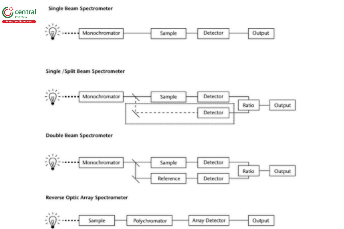 All modern UV-Vis measurements involve detecting and measuring the intensity ratio of the radiation at a certain wavelength in the presence or absence of the absorbing sample (transmitted radiation and incident radiation). Figure 1shows schematics of four typically encountered optical designs: single-beam, single split-beam (where the reference detector is located within the internal optics of the system), double-beam, and reverse optic array spectrometers. Dispersion of light to achieve the desired resolution can occur before (as in the first three configurations) or after introduction of the sample, but all commercial UV-Vis instruments share the following features to perform these functions: