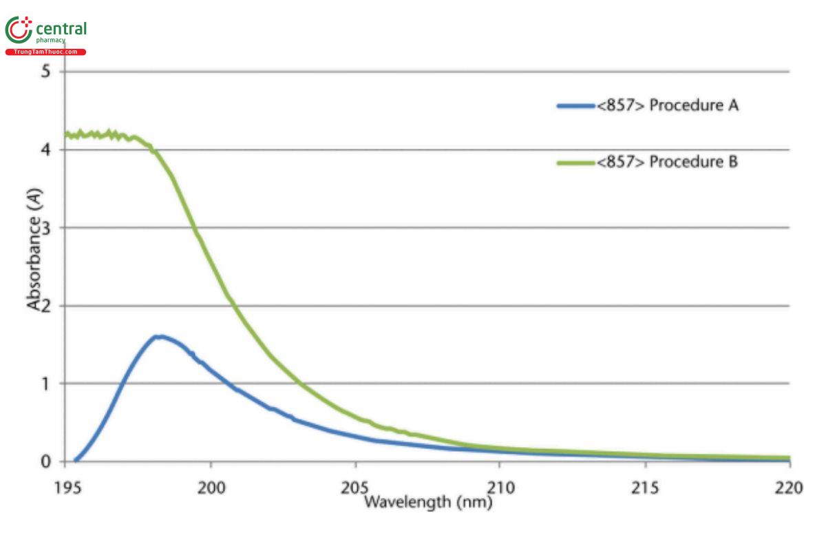 This method therefore avoids the potentially difficult procedure (see 〈857〉, qualification of UV-Vis Spectrometers, Estimation of the Limit of Stray Light (Stray Radiant Energy), Procedure B) to nd appropriate attenuation filters in the UV region required to "back-off" the system, especially if using a modern double-monochromator spectrometer, and also avoids the measurement performed at the limit of the instrumental range and analog-to-digital electronic resolution. Figure 4 shows spectral proles acquired of a potassium chloride solution using both 〈857〉, Procedure A and 〈857〉, Procedure B.