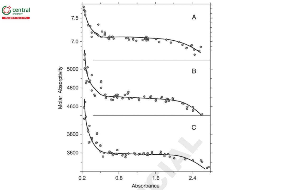 Determination of the optimum photometric range is fundamental to establishing the capability of a given instrument before and during method validation. The importance of this procedure can be shown by the fact that in 1945 Vandenbelt et al. attempted to establish the optimum absorbance range on the then-new Beckman DU spectrometer (1). They suggested a simple approach in which the molar A1%1 cm absorptivities of various compounds are measured at different concentrations. This approach is shown theoretically in Figure 5, where the center plateau is used to define the photometric range.
