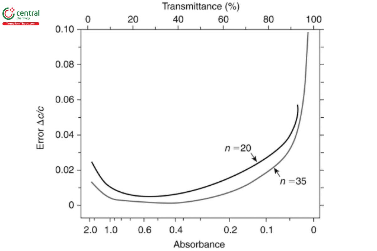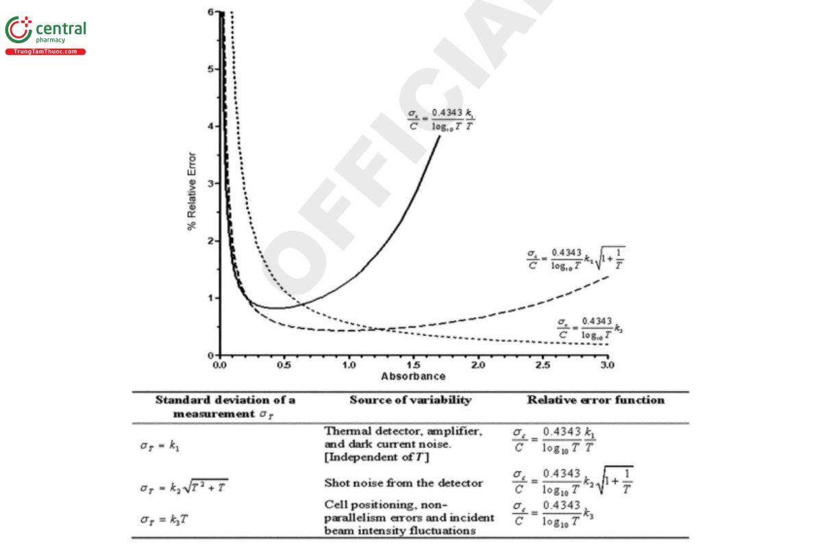 Both approaches clearly show that in addition to the expected increasing error at higher absorbance levels caused by stray light and other factors, there is a similar, if not larger possibility for increasing error at low absorbance levels caused by instrumental variances in the form of noise from the detector, source, etc. This variance often is overlooked in the desire for economy of scale, when analysts use smaller samples and shorter path lengths and therefore lower measured absorbance values.