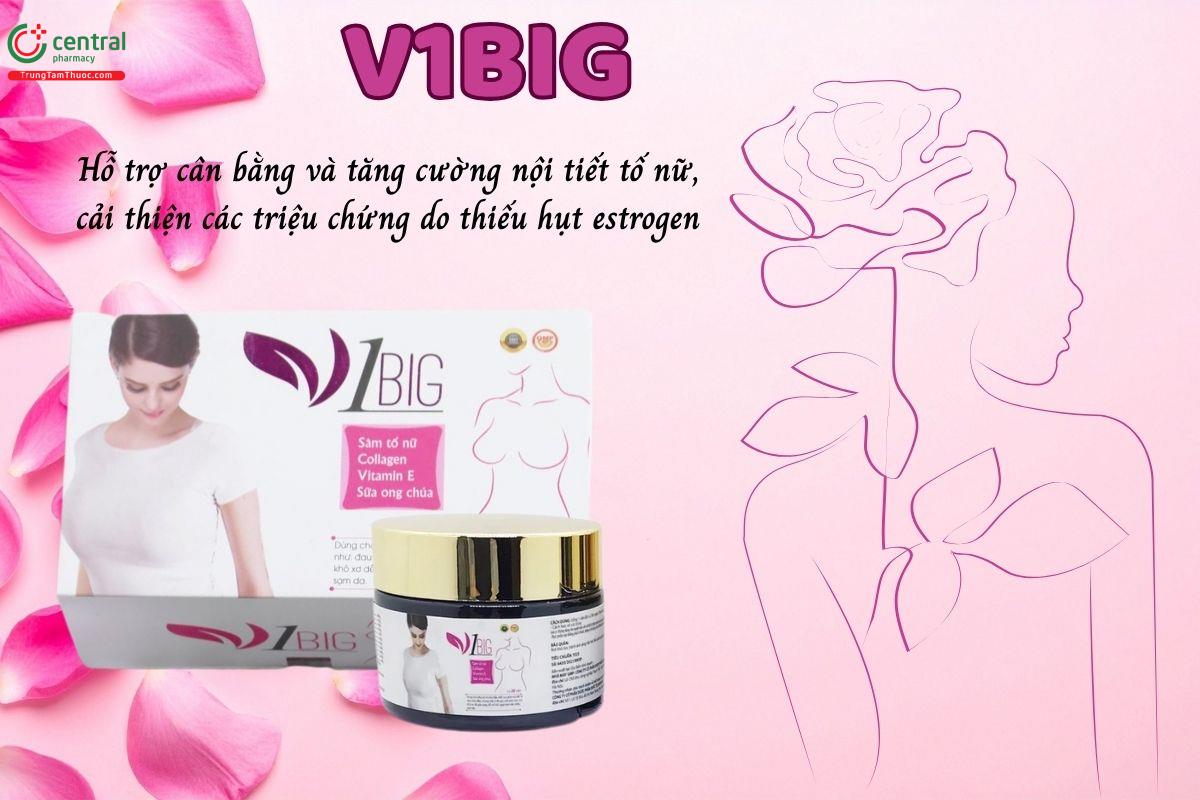 Viên uống V1BIG giúp hỗ trợ cân bằng và tăng cường nội tiết tố nữ, từ đó cải thiện các triệu chứng do thiếu hụt estrogen như bốc hỏa, rối loạn kinh nguyệt, giảm ham muốn và các dấu hiệu lão hóa da. Ngoài ra, còn giúp duy trì làn da tươi sáng, săn chắc và tăng cường sức khỏe tổng thể cho phụ nữ.