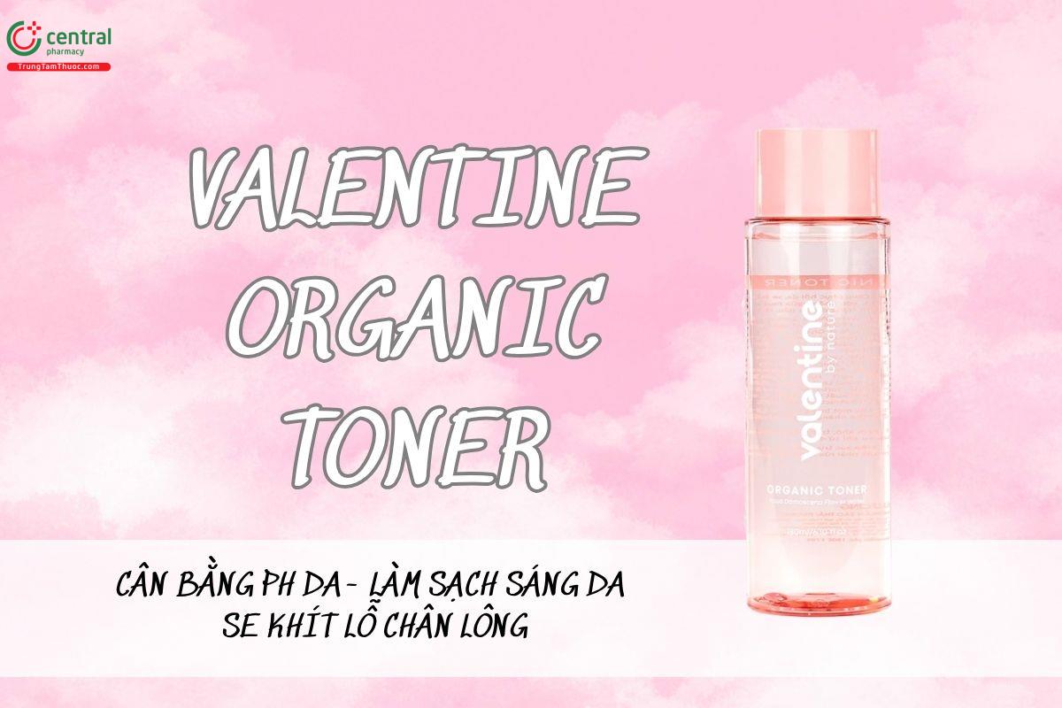 Valentine Organic Toner là Dung dịch chăm sóc da giúp cân bằng pH, loại bỏ tạp chất còn sót lại sau bước làm sạch, đồng thời bổ sung độ ẩm cần thiết cho da. Sản phẩm hỗ trợ làm mềm da, thu nhỏ lỗ chân lông, phục hồi da và góp phần hạn chế hình thành mụn. Nhờ các chiết xuất thiên nhiên, toner còn giúp cải thiện sắc da, giảm thâm nám và mang lại cảm giác dễ chịu sau khi sử dụng.