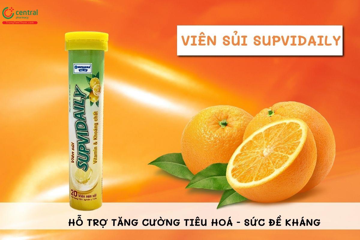 - Viên Sủi Supvidaily cung cấp một loạt các vitamin và khoáng chất thiết yếu giúp bổ sung kịp thời cho cơ thể, dạng viên sủi tan trong nước giúp dưỡng chất dễ hấp thu hơn.