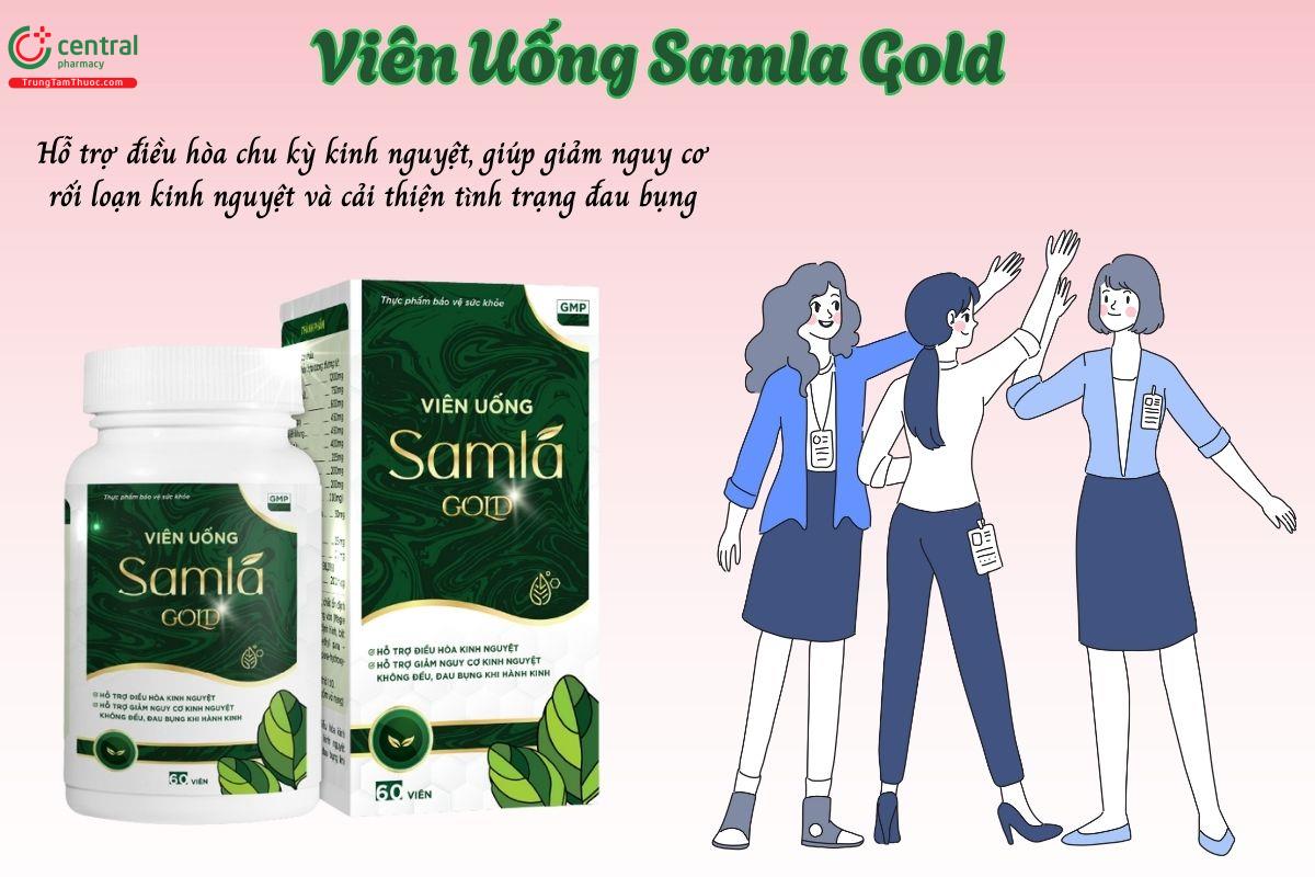 Viên uống Samla Gold có tác dụng hỗ trợ điều hòa chu kỳ kinh nguyệt, giúp giảm nguy cơ rối loạn kinh nguyệt và cải thiện tình trạng đau bụng, căng tức, mệt mỏi trong những ngày hành kinh.