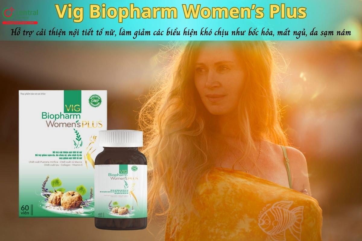 Viên uống Vig Biopharm Women’s Plus giúp hỗ trợ cân bằng và cải thiện nội tiết tố nữ, từ đó góp phần làm giảm các biểu hiện khó chịu thường gặp như bốc hỏa, mất ngủ, da sạm nám, chảy xệ hay suy giảm ham muốn do rối loạn hormone nữ giới.
