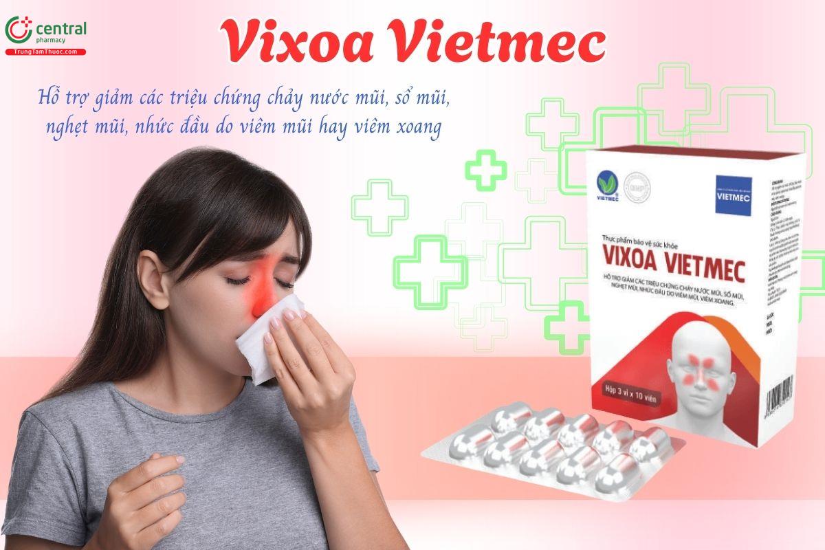Thực phẩm bảo vệ sức khỏe Vixoa Vietmec giúp hỗ trợ làm giảm các triệu chứng khó chịu liên quan đến viêm mũi, viêm xoang, bao gồm chảy nước mũi, sổ mũi, nghẹt mũi và nhức đầu. Sản phẩm phù hợp cho người lớn đang gặp các vấn đề về viêm mũi hoặc viêm xoang, cần hỗ trợ làm giảm các triệu chứng trên.