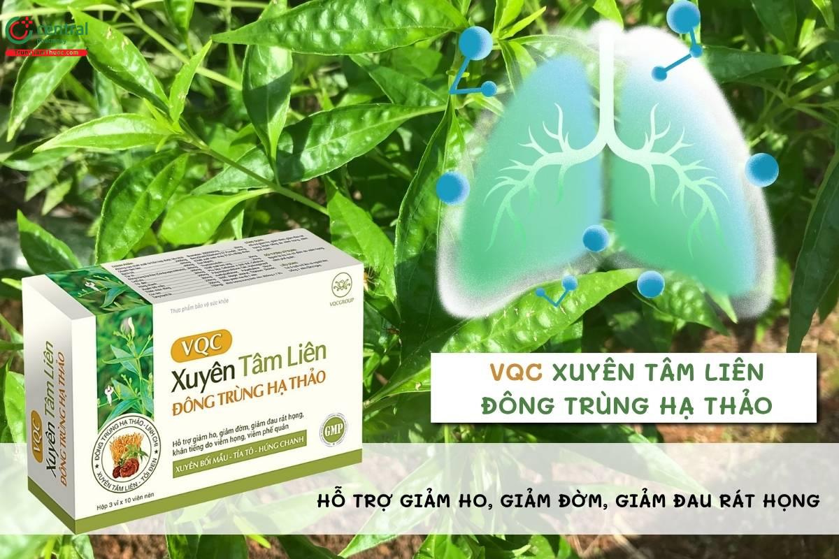 - VQC Xuyên Tâm Liên Đông Trùng Hạ Thảo chứa các thảo dược tự nhiên như Xuyên Tâm Liên, Bách Bộ, và Đông Trùng Hạ Thảo…an toàn, chưa ghi nhận tác dụng phụ.