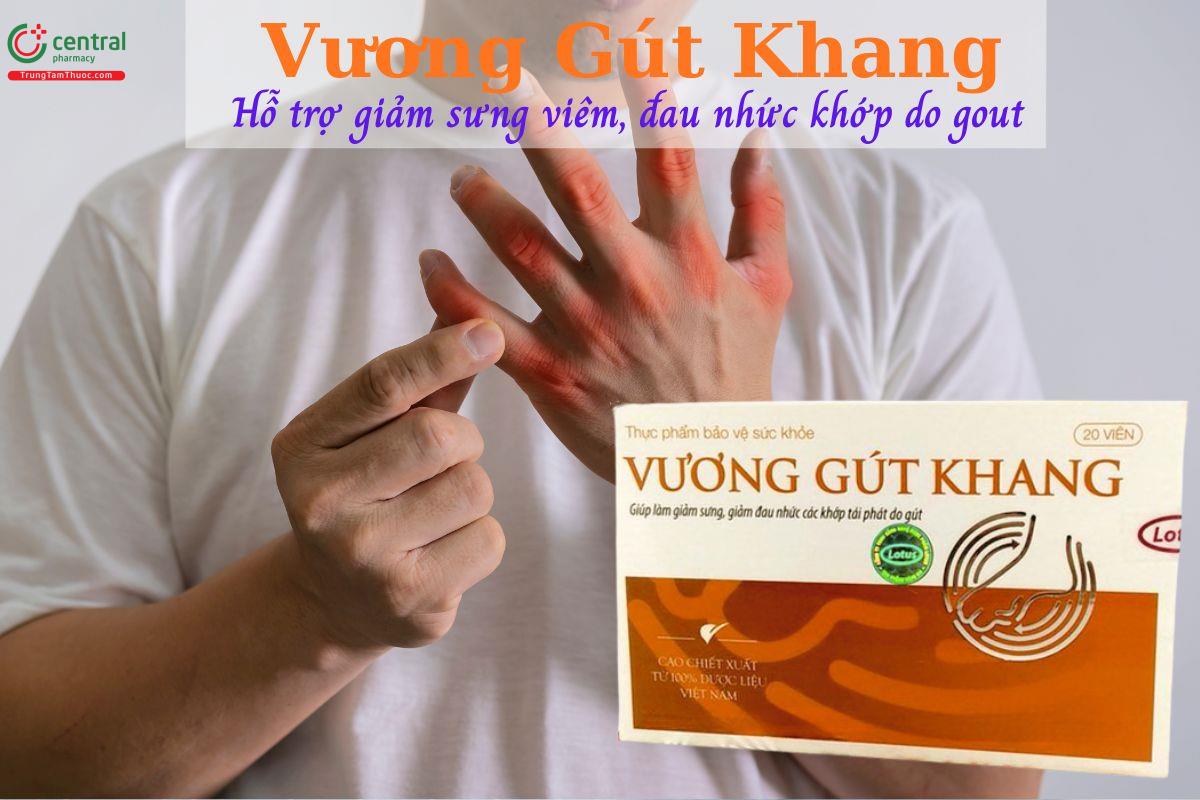 Vương Gút Khang có công dụng giảm nồng độ acid uric trong máu, đồng thời giúp giảm tình trạng sưng viêm và đau nhức tại các khớp do bệnh gout gây nên.