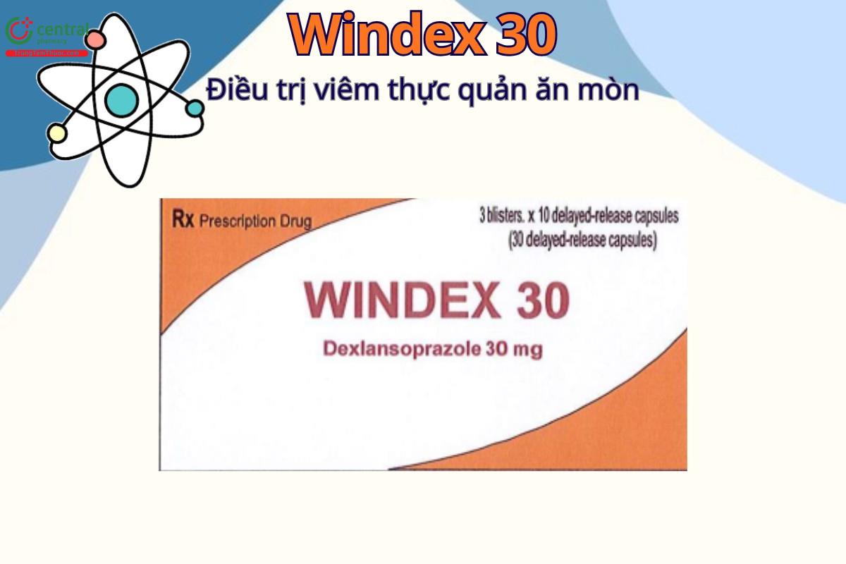 Windex 30 chứa Dexlansoprazole, một chất ức chế bơm proton (PPI). Dexlansoprazole ức chế sự bài tiết axit dạ dày bằng cách ức chế chọn lọc hệ thống enzyme H+ - K+ - ATPase (bơm proton) tại bề mặt tiết của tế bào thành dạ dày. Đây là bước cuối cùng của quá trình bài tiết axit. Dexlansoprazole là đồng phân R của lansoprazole, đặc điểm này giúp thuốc có thời gian lưu lại trong cơ thể lâu hơn so với đồng phân S, từ đó kéo dài khả năng ức chế axit.[2]