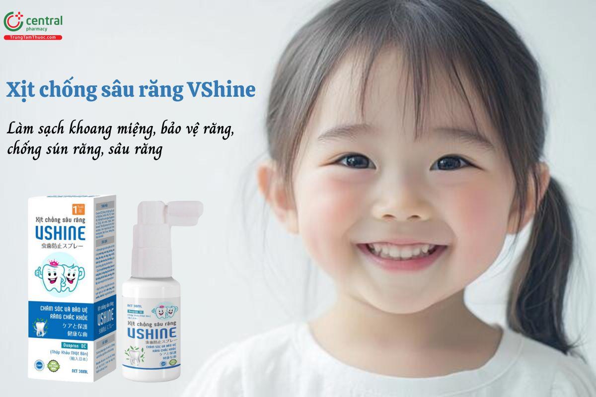 - Xịt chống sâu răng VShine chứa thành phần OVopron DC nhập khẩu từ Nhật Bản, tinh dầu Đinh Hương, xylitol, có tác dụng hạn chế mảng bám, ức chế vi khuẩn gây sâu răng, góp phần làm giảm nguy cơ sâu răng và giữ cho khoang miệng luôn sạch sẽ.