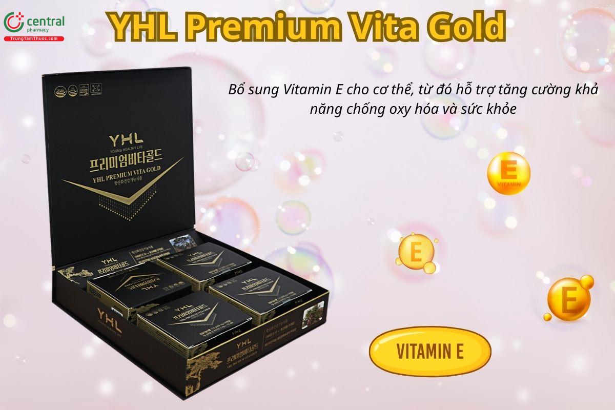 Viên uống YHL Premium Vita Gold giúp bổ sung Vitamin E cho cơ thể, từ đó hỗ trợ tăng cường khả năng chống oxy hóa, góp phần bảo vệ tế bào trước tác động của các gốc tự do. Sản phẩm phù hợp cho người trưởng thành.